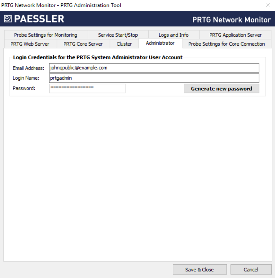 Click Generate new password and confirm to generate a new password for the PRTG System Administrator user account. Click Save & Close to set the new password. You use it when you log in to the PRTG web interface or the PRTG app for desktop.