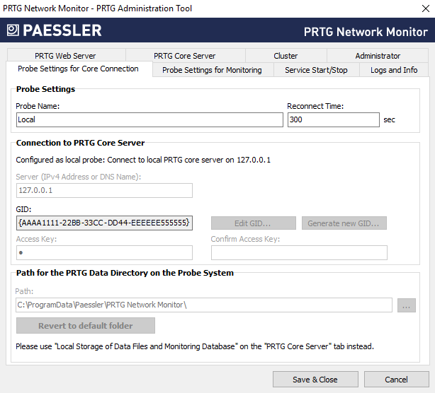 i_round_blueEdit GID and Generate new GID are only available on the remote probe system. For more information, see section PRTG Administration Tool on Remote Probe Systems.
