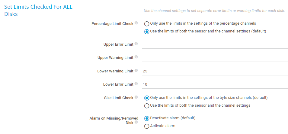 In this section, you can set limits that are valid for all channels and all drives. By entering limits, you can define when the sensor shows the Warning or the Downstatus, depending on the data provided by all drives that this sensor monitors. If you want to individually define limits for separate channels, use the limit settings in the channel settings.